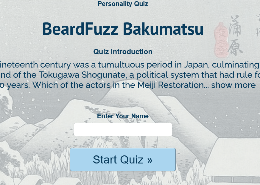 Teaching The Road To Kyoto (teaching resource) Tokugawa Top Trumps (class exercise) This Bakumatsu quiz was a result of converting the Tokugawa Top Trumps exercise to an online-friendly format. The students put together the questions and answers, and we uploaded it to this site. Glimpses of the Unfamiliar (syllabus) Share this: Share on X (Opens in new window) X Share on Facebook (Opens in new window) Facebook Like Loading...